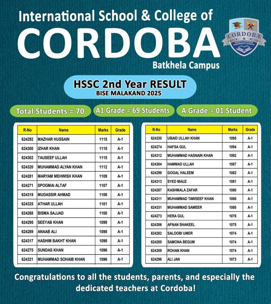 We are proud to announce that the International School & College of Cordoba, Batkhela Campus, has once again proven its academic excellence in the HSSC Annual-I Examination 2025. Our talented students have achieved outstanding results, setting a benchmark of dedication, discipline, and determination.